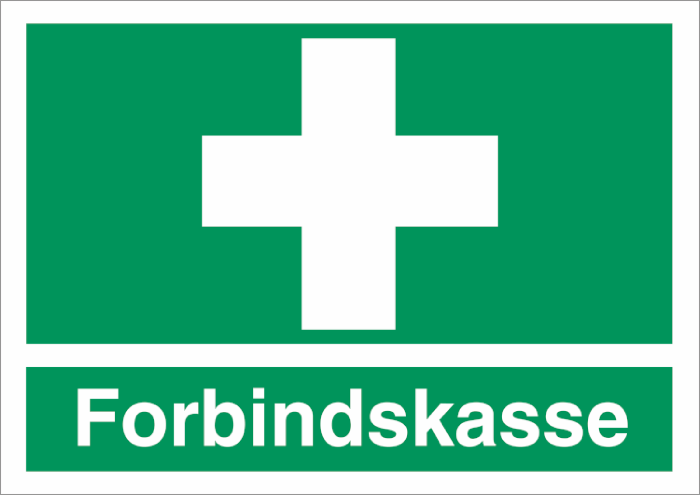 Et henvisningsskilt der tydeligt markerer hvor forbindingskassen er placeret, er til stor hjælp. En forbindskasse vil i dette tilfælde, være det samme som udstyret til førstehjælp og det skal naturligvis kunne findes hurtigt, så man kan få behandlet den uheldige medarbejder.