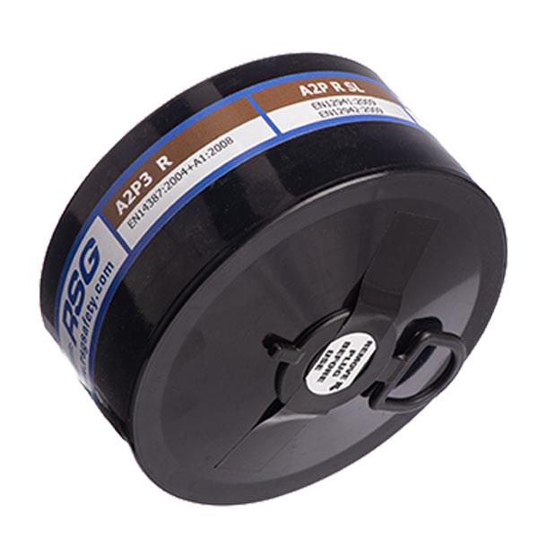 RSG A2P3-filterbeholderen (plastik) har en standard EN148-1 gevindforbindelse og beskytter mod organiske gasser og dampe med et kogepunkt> 65oC og alle slags faste og flydende partikler.