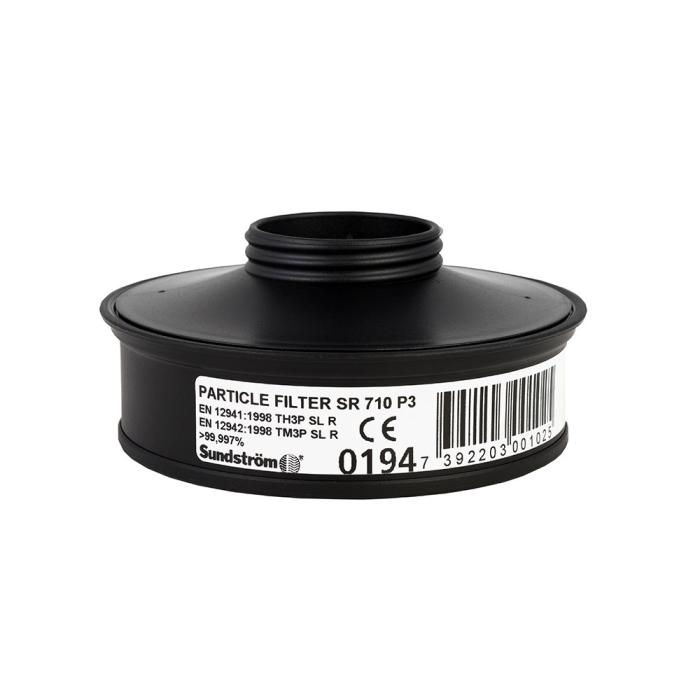 Partikelfilteret SR 710 er forsynet med et specielt gevind og er designet til brug i den batteridrevne ventilator Sundström SR 500/SR 500 EX/SR 700 som et separat partikelfilter, dvs. det kan ikke kombineres med et gasfilter. Filteret er af typen P3 R* og giver beskyttelse mod alle typer partikelforurenende stoffer. Hvis der er behov for et kombineret filter til ventilator SR 500/SR 500 EX, skal gasfilteret kombineres med SR 510 partikelfilteret. Filteret skal kombineres med forfilter SR 221 for at forlænge dets levetid. * R (Genanvendelig): Filteret er beregnet til at blive brugt i mere end et enkelt skift.