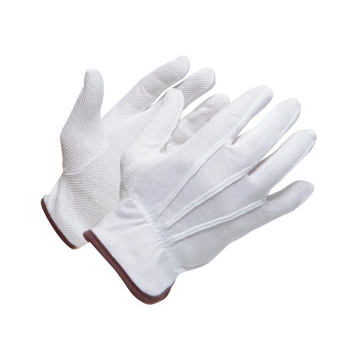 Hvid bomuldshandske med små dupper af vinyl. Velegnet til håndtering af plast og lakerede emner.