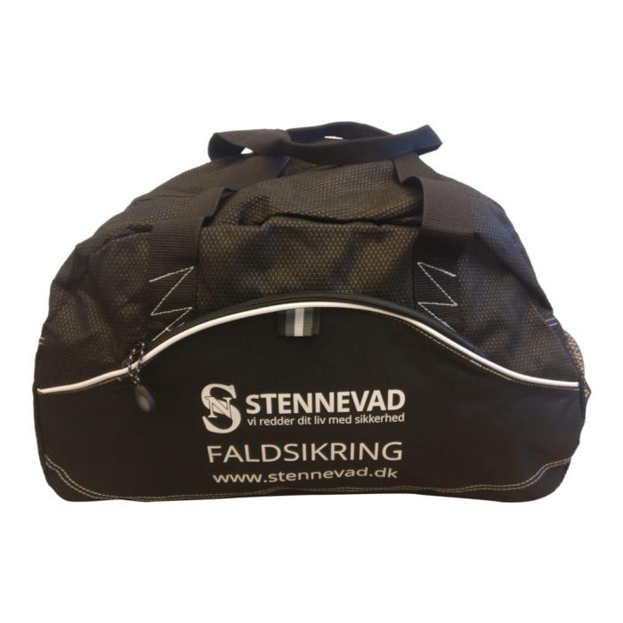 Sportstaske i sort påtrykt "Faldsikring". 50X30X25 cm. Handy transporttaske.